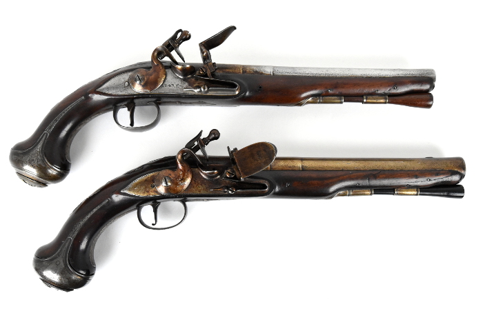 This pair of silver mounted flintlock pistols have a very unusual safety mechanism. The Frizzens can be swiveled out of the path of the hammer. Along with British view and proof marks, the barrels are marked with a star over "IB". This is the maker's mark of the highly regarded James Barbar.