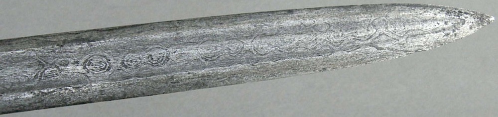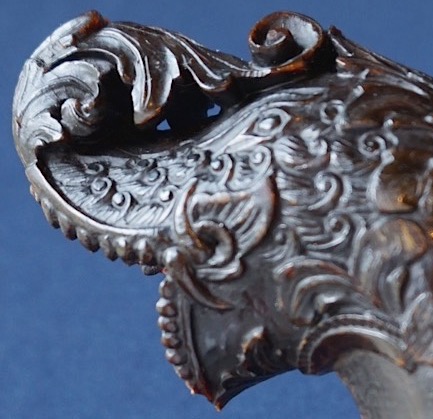 This example has a well-controlled pamor mlumah with subtle/calm patterning and on top of this a pattern-welded "…XIIIXIIIX…” motif: This motif is commonly seen engraved or inlaid at the back of blades; here it is done in a similar way at the side of the blade as part of the forging work. Need to bring it out with a fresh etch, I guess. This type of pommel with a rather obvious head and its distinct features is a variant of the ubiquitous Makara form and originates from the northern Malay culture, probably Pattani and neighbouring sultanates. Horn with old remnants of Melayu dragonblood paint visible inside the mouth; silver fittings and an old tassel. A closely related pommel type is known from Pattani nobility badek (cp. Spirit of Wood, p. 152). Also note the heavy bolster (thickness 12.6 mm = 1/2”) in front of the guard! Regards, Kai (Pictures courtesy of our forumite kino since I have yet to receive this piece obtained early this year - thanks heaps for your help, Albert!) |