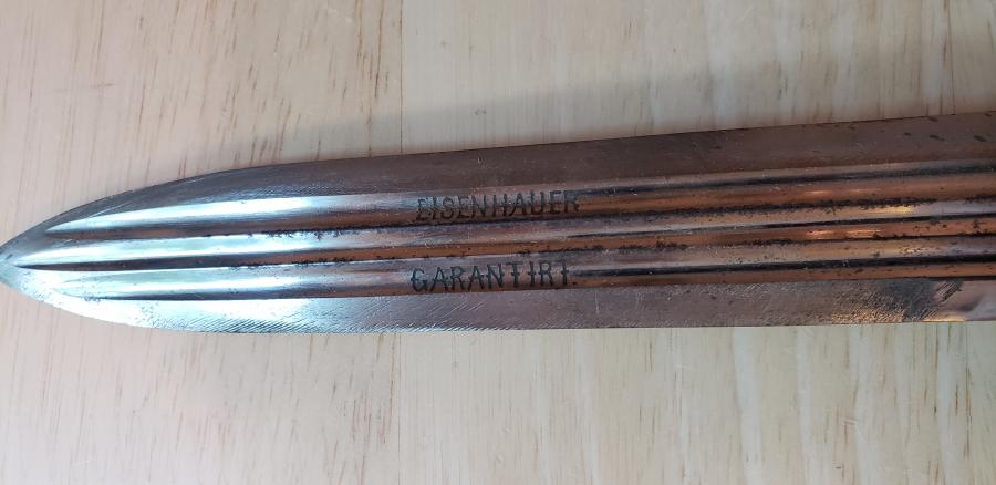 This has been in its better days a Saxon infantry sword M 1867. The monogramm "AR" stands for Albert, King of Saxony, +1902. The Eisenhauer"-mark is a sign of quality and durability of the blade - ironcutter should be the exact translation.
