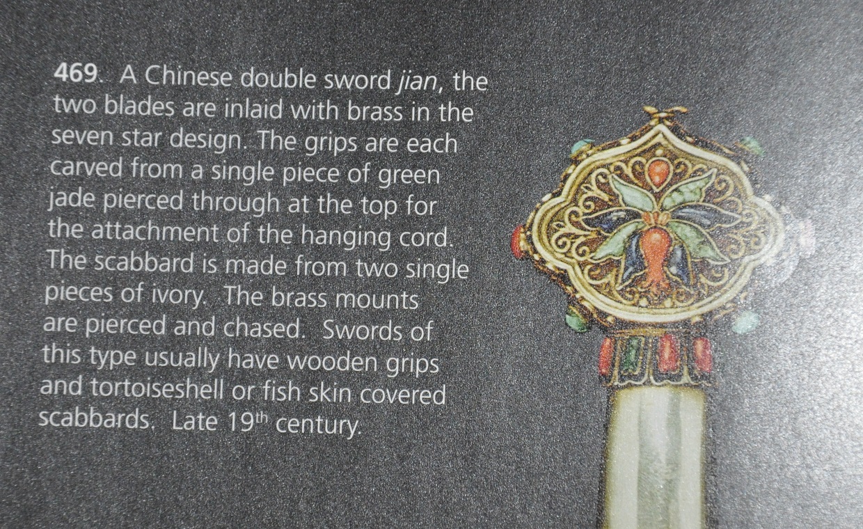 Provenance is something that auctioneers and retail dealers are pretty cavalier about. About a decade ago, at the Las Vegas Antique Arms Show, I saw a very nicely made example of this genre, a jian (double edged sword), with the lavish silver and hardstone deco befitting something sold at Vegas, with a "provenance " document linking it to the estate of a US military officer who served in the Far East, including China, in the early 1930s. It was merely a typrwritten letter from someone in the family, dated some years before I saw the sword, attesting to the fact. Together with some old new clipping about the owner, but not mentioning the sword. I rather doubted whether it was even the original typed document that it claimed to be. . The sword may well have been early 20th cent. it was a fine example of the type for someone who really liked this stuff, but the unsubstantiated war story really didn't do a thing for it. But buyers are funny. Someone else might buy the story and think the piece is truly important because of this. " Men tend to believe in those things which they wish to be true." --Julius Caesar. |