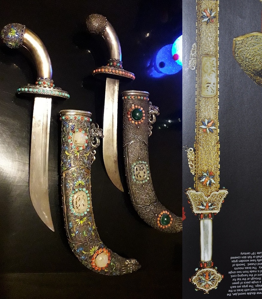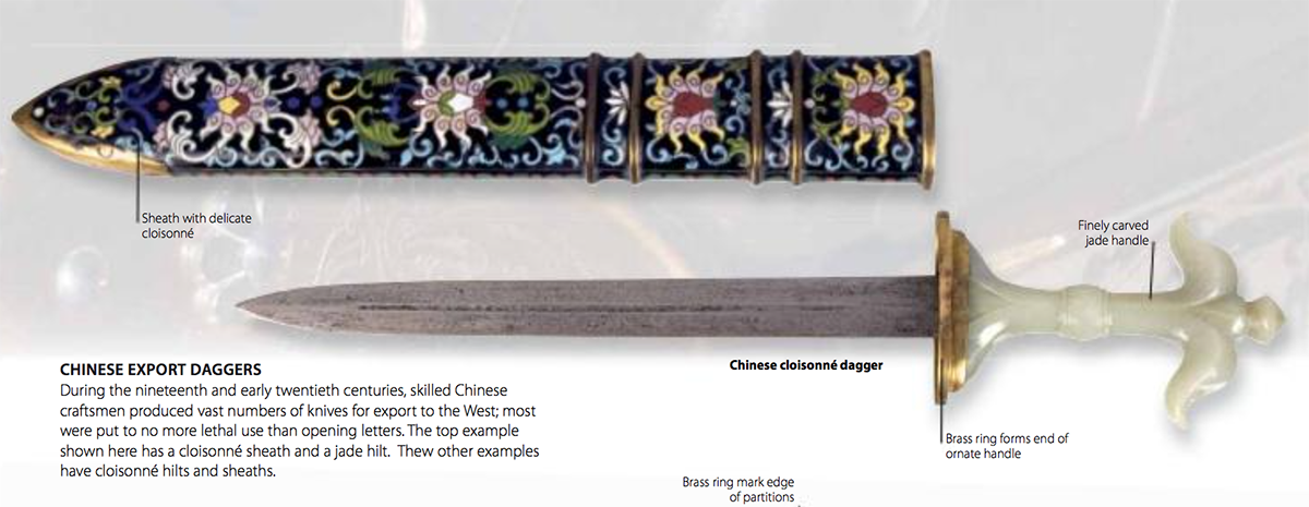 This is not exactly the same style as your daggers, but here is an image from Illustrated Encyclopedia of Weaponry (frankly i don't know much about this source) that makes mention of Chinese cloisonné daggers and makes the claim that they were created for sale to the West. |