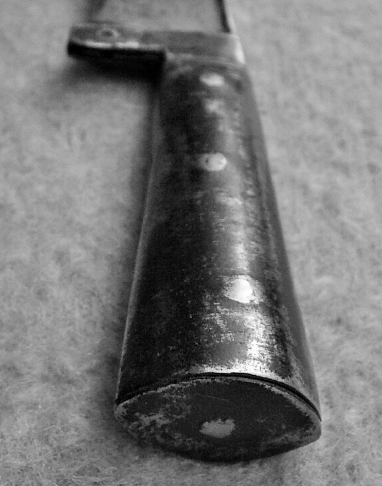 picked up this yataghan last week. 22.5 in. long sharp blade, unmarked, 1.25 in. wide at the all steel grip, t-spine, 3/16 in. thick at the grip, Four inch sheet steel scale grip, held on by three rivets, lenticular shaped steel butt plate held by peening to the tang. May be some sort of filler inside. 250grams in weight. No scabbard. 'Bolster' at oval grip/blade junction is very much like a Khyber knife, as is the t-spine. Un-fullered blade section is Khyber-like in section, though not the tapered wedge of those knives. Looks like a cross between a Turkish and Afghani design. Grip looks like it may have had a wrapping of some sort. Blade is comfortable in the hand with the thumb and forefinger pinching the 'guard. Remaining 3 fingers on the grip and the but fits right in the palm. ready for a chop, slice or thrust.