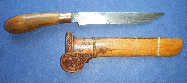 The knife itself is a peurawot from Aceh I guess, see here: http://www.vikingsword.com/vb/showth...highlight=aceh. English bread handles sometimes seen on knives from mainland SEA, it's the first time I saw an English handle with an Indonesian blade. ![]() Regards, Detlef |