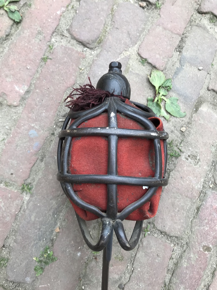 I noticed this sword at auction. The thing that kept me off was the modern bolt attached to the pommel which seems to be a clue of more recent manufacture (a copy) and so did the velvet inside the basked compared to the rest of the steel.