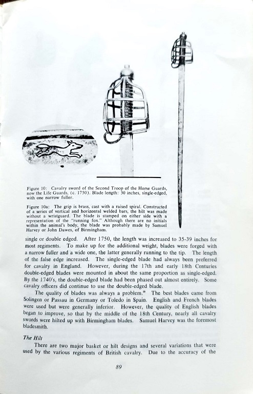 The blades were usually backsword (single edge) and from 34-39". While often German blades, there is evidence many of these were made either in Shotley Bridge in the north, or by Harvey himself.