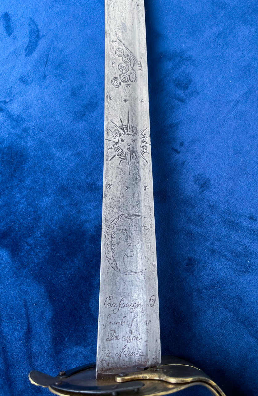 The engraving is very similar to what is on one of my French swords by Cassaignard in Nantes where he worked as a furbisher from 1774 to 1812. From what I have read, it is believed he used Solingen made blades, but the sword, sun and face in the moon images are common on his sword. I’d be curious to hear if there is any writing under the langets.