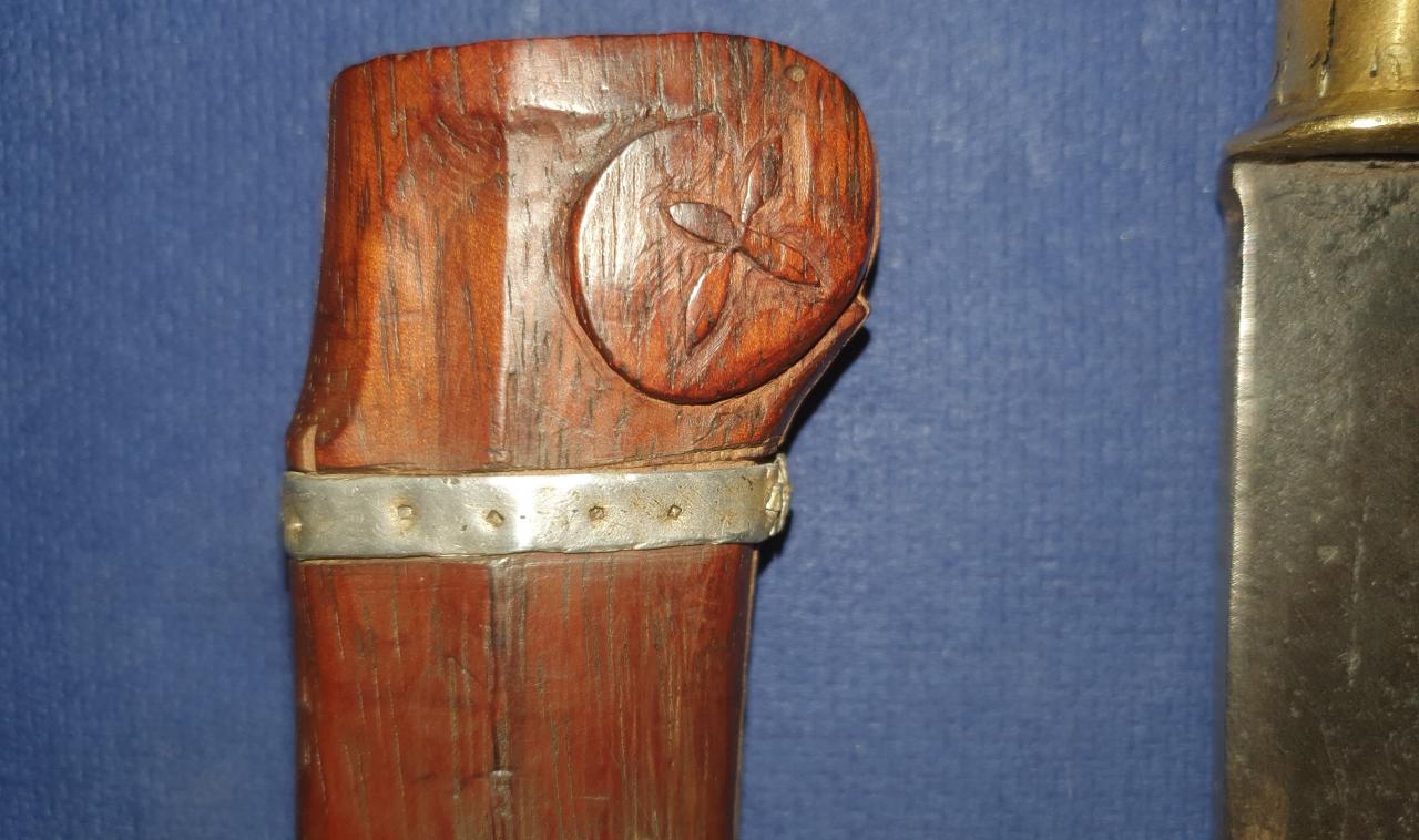 I'll add my voice to those who congratulated you on a very fine sword. There is a lot of "rustic" character in the sword itself. I particularly like the brass hilt, which seems to have some age judging from how the designs have worn from handling over the years. The blade similarly looks old and you noted a nice patina. Just from these pictures, the sword looks to be at least 19th C. in manufacture, although the scabbard might well be later. Very nice. Ian. |