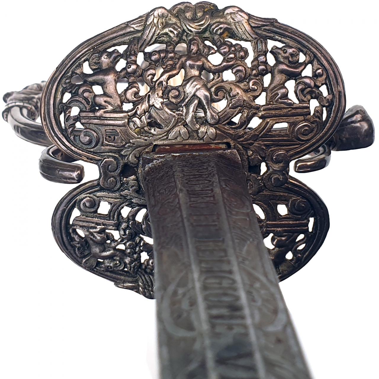 Interesting thoughts, I confess I have not see Latin used on swords from Germany or the Netherlands and I agree it appear to be a very Catholic moto. The hilt is solid silver but not hall marked suggesting it was made as a special order according to AYLWARD-J-D The Small Sword in England Pp 93.