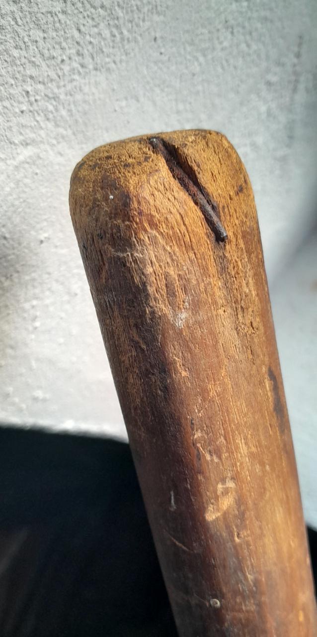 Looks OK to me. Robust and fit for purpose! The edge looks like it was sharpened which is a good sign. I think the bottom nails came off the langets which left the bottom end flapping, so rather than fixing new nails a previous owner simply cut off the bottoms. The cut off parts left marks on the wood so you know they were there.