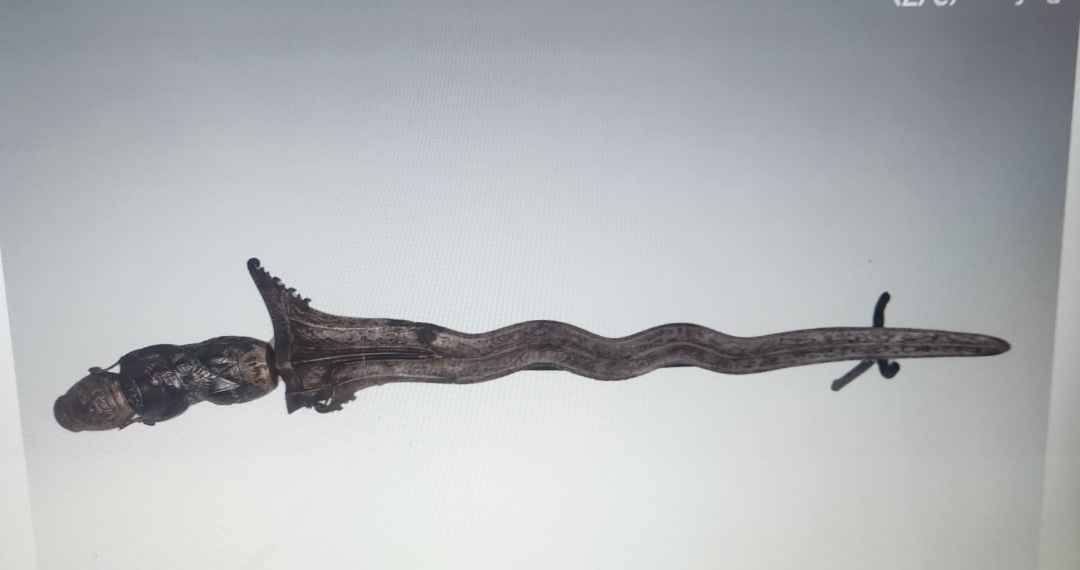 Also two pictures of a blade, which was auctioned in UK about ten years ago. I would say, both blades are stylistically very close. Regarding the fluted body - the idea of it comes from an Majapahit architectural element, which does live forth in Pasisir hilts. The original thought of this architectural element quite possibly is banyan tree trunk. The meaning of hilt and related Pasisir hilts thus could be a spiritual entity, which resides in a banyan tree - a very common idea in Indonesia. |