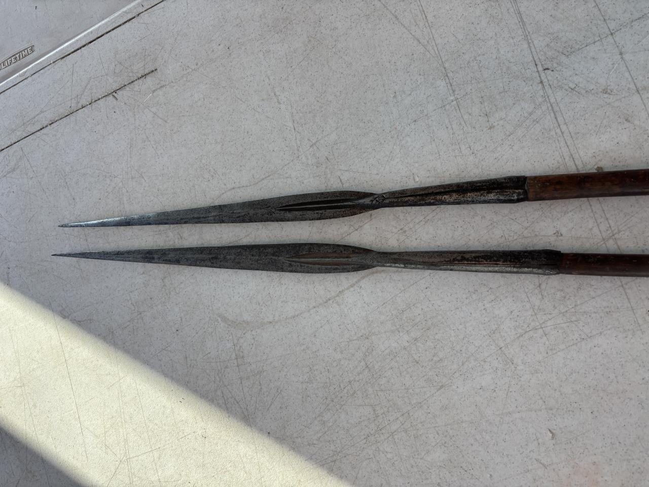 The next of shakethetrees' items is a pair of spears clearly of similar origin, with bamboo shafts and leather-capped ends. One has a painted number "110" on it. These are 84-1/4" and 93" long, respectively.