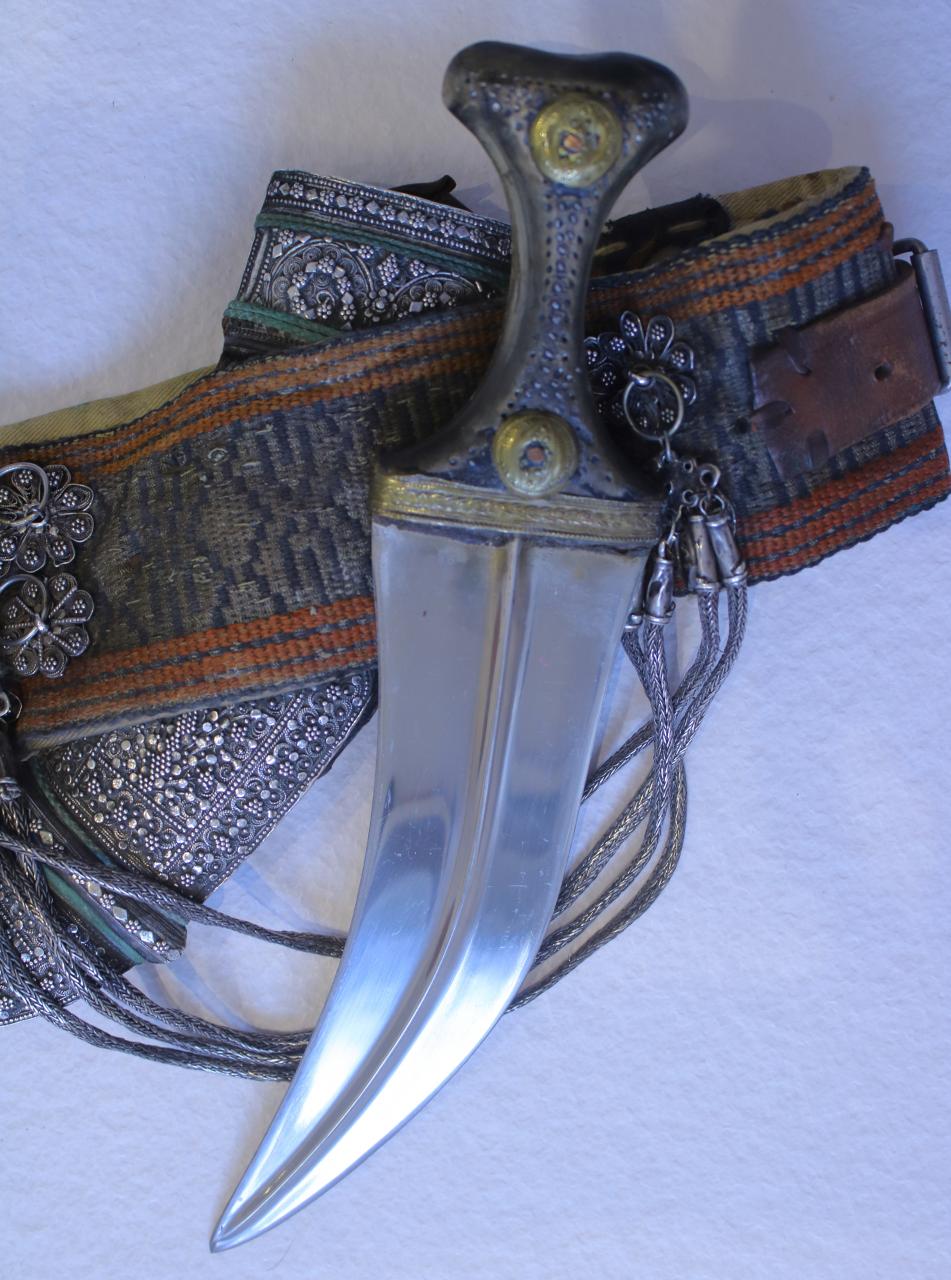 One of my latest acquisitions, a thouma jambiya with a silver scabbard and belt with silver accessories. The quality of the silverware is quite good. I spent a few hours cleaning up the silver with a toothbrush and a very small amount of water and toothpaste and finished with a silver polishing cloth. Rewarding, much more detail became visible. The jambiya is again one of the hollow blade type and the quality is much lower than that of the scabbard. I wonder if they belong together even though the fit is good. Has traces of use but estimate 2nd half 20th century. Comments welcome.