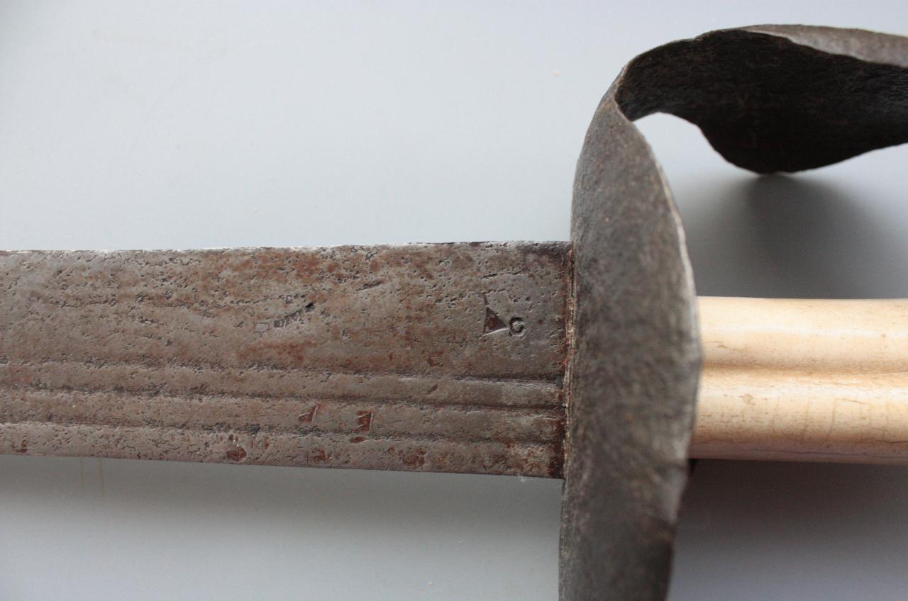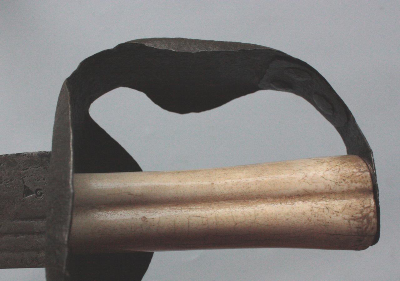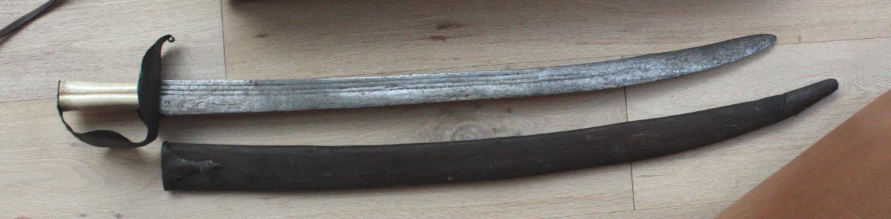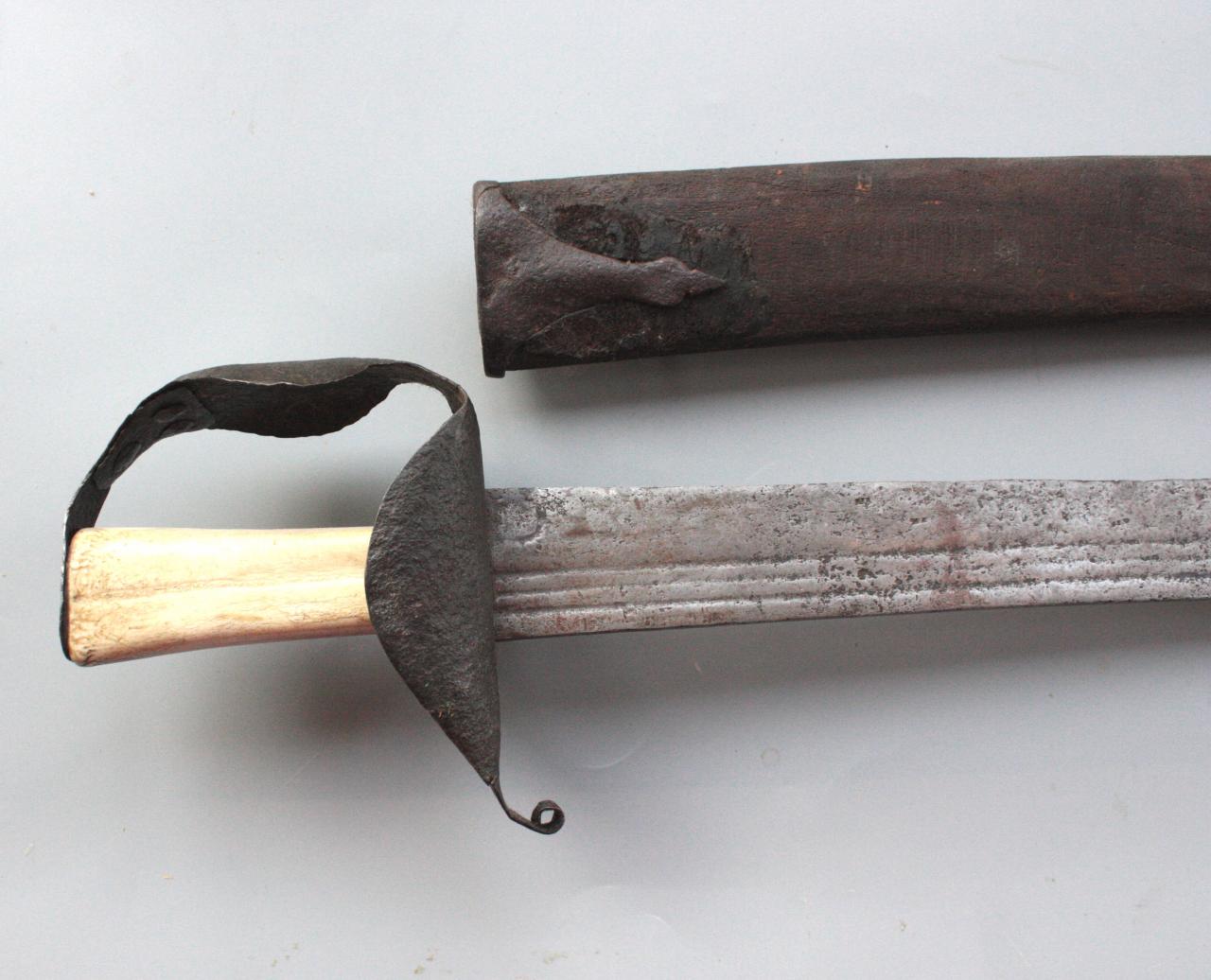 On the American cutlass just noted, the example has a tapering bone grip, which compellingly aligns with this. The blade is of similar shape, 24" but no fullers.