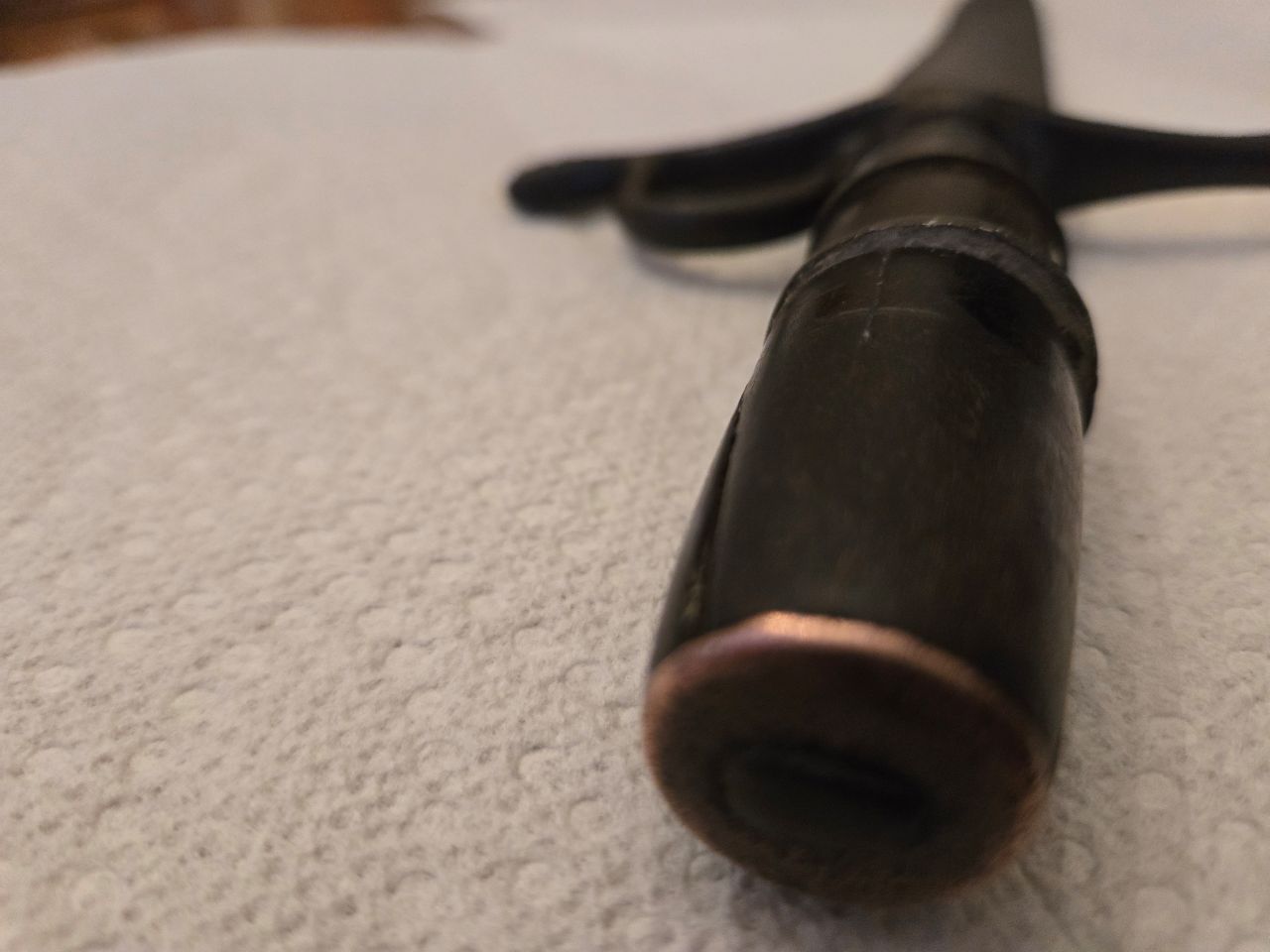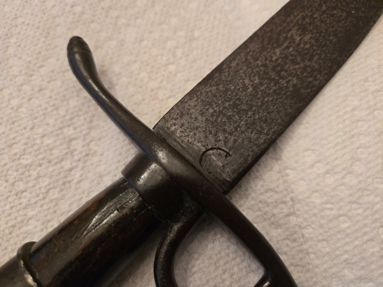 Hello again. Recent short sword purchase from estate sale via online auction here in Baltimore, MD. 18.5" overall with 13.5" blade. Assume Revolutionary War era due to the "homemade" simplicity and chunkiness of the hilt and lack of decoration other than simple scribed quillions. But maybe that is not correct? Cross guard and quillions are iron. Wooden handle with intermediate metal "washers" and simple copper cap. Blade style has that slight dip to it in middle. Has a letter "C' marked on blade with a barb (like a fish hook?) at top of the C. Wondering if anyone has seen this mark before? Also curious about the big finger ring/loop which is under the hilt. Is that an unusual location or size for it? (actually feels pretty comfortable to hold with finger thru it...plenty of room). Haven't seen anything similar to that ring in the Rev. period reference books I have. Maybe this is just a blacksmith one-off? Also came with a leather hilt with copper rivets, simple decorative stamping on one side, copper wire stitching on the other. Any thoughts on this one would be greatly appreciated!