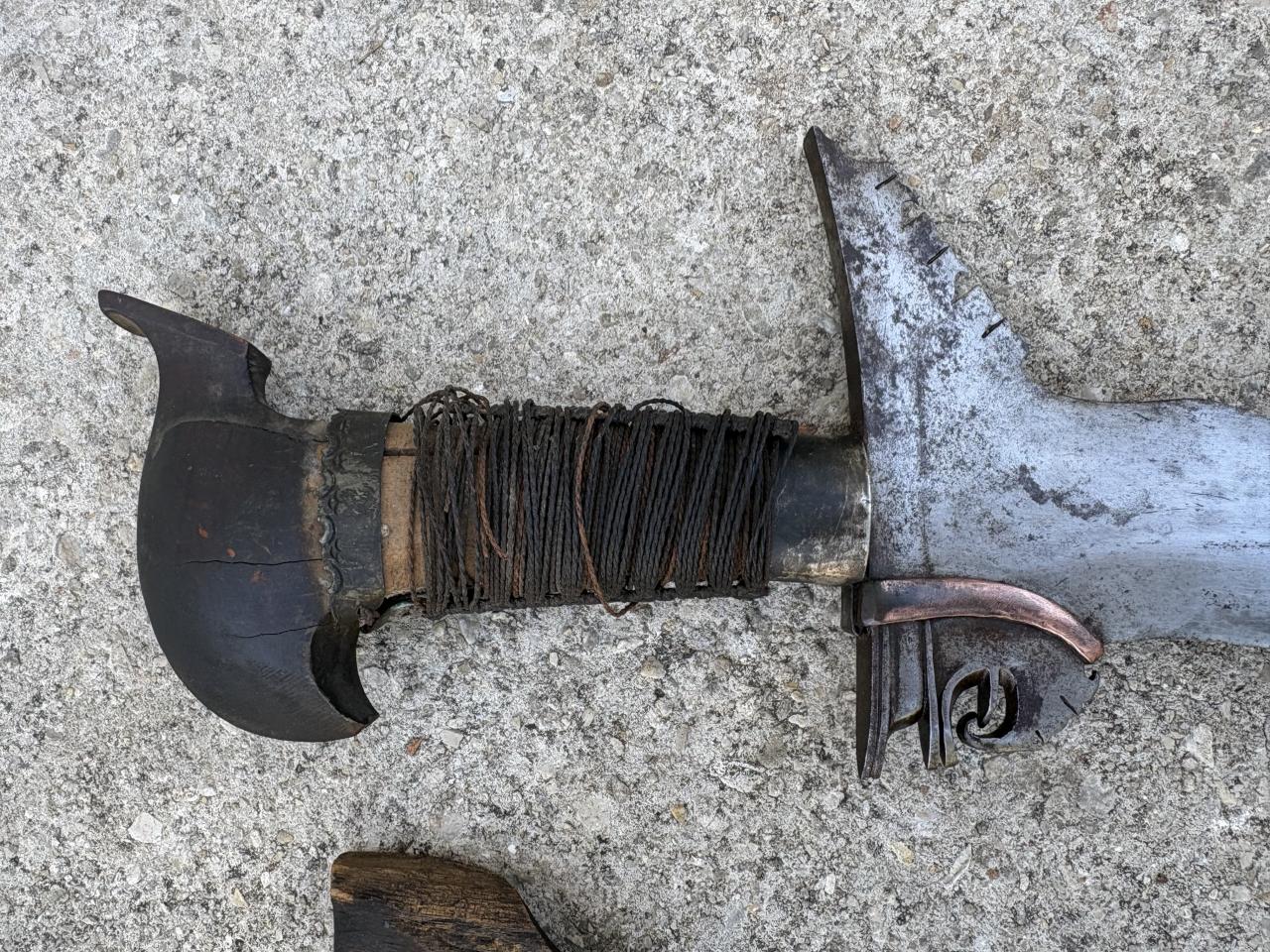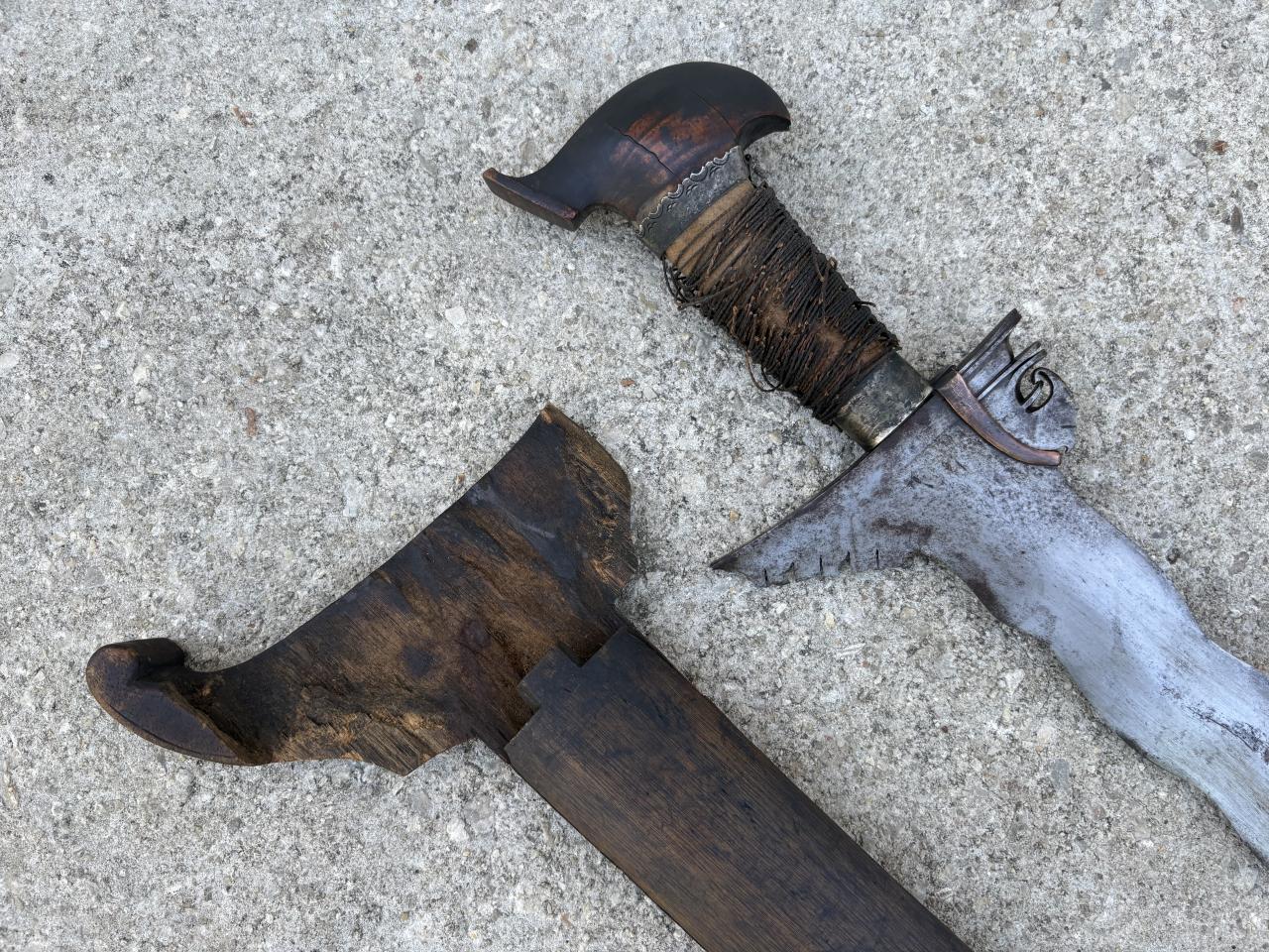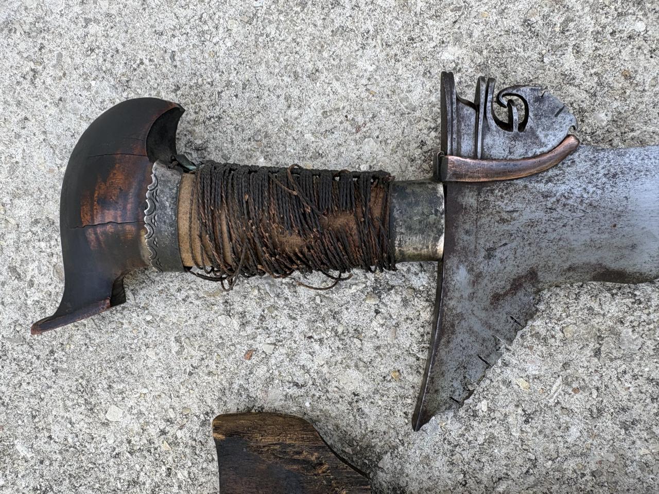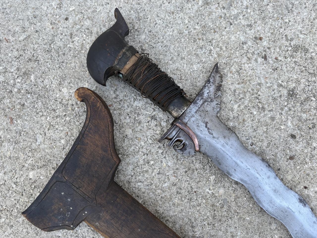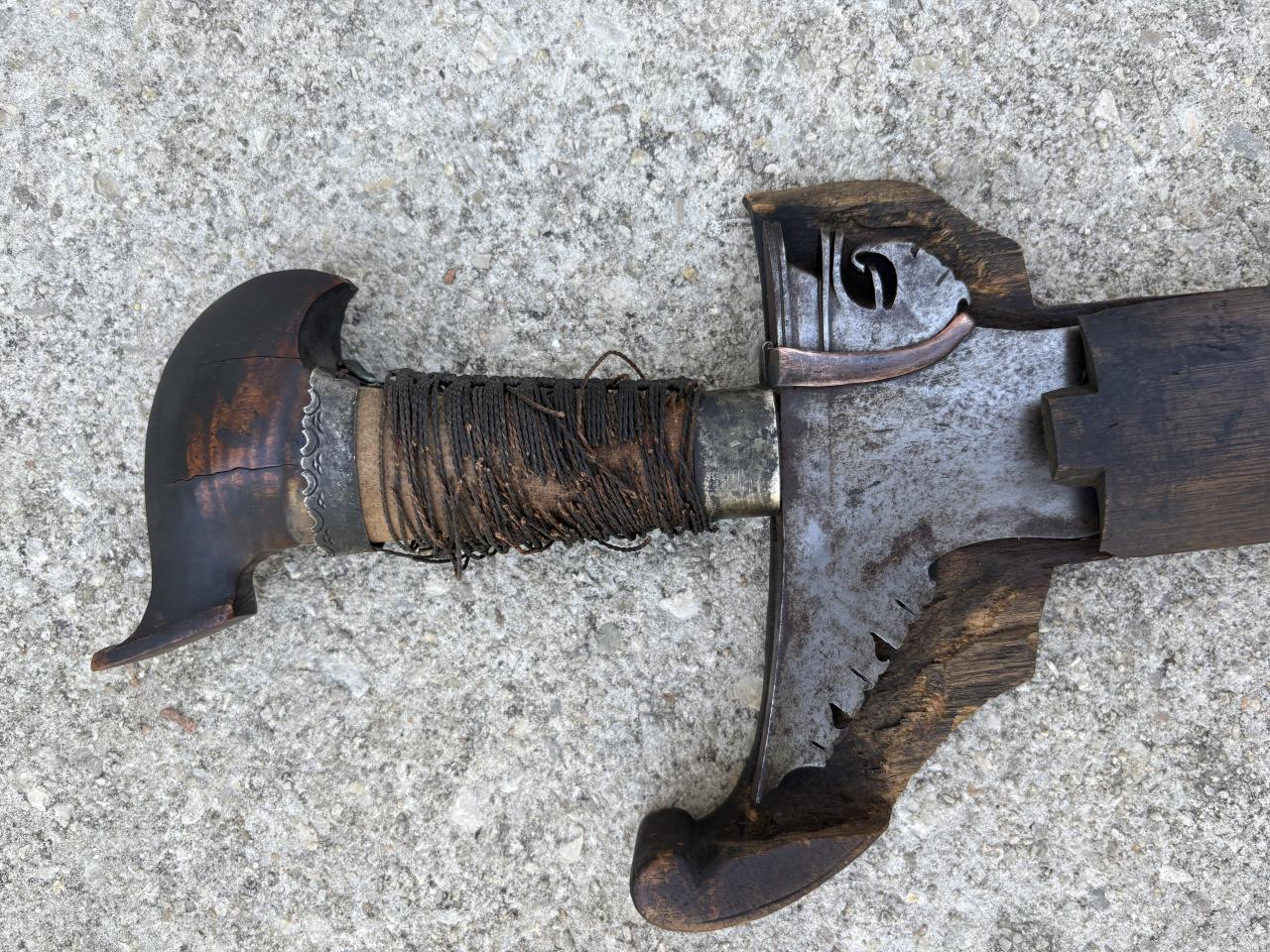 Just acquired my first legitimate older kris. It looks to be intact (except for the scabbard) but in poor shape. I would like to clean the blade and try to preserve the handle. As you can see the cord wrapping around the this totally shredded. I do believe the pommel is banati wood.