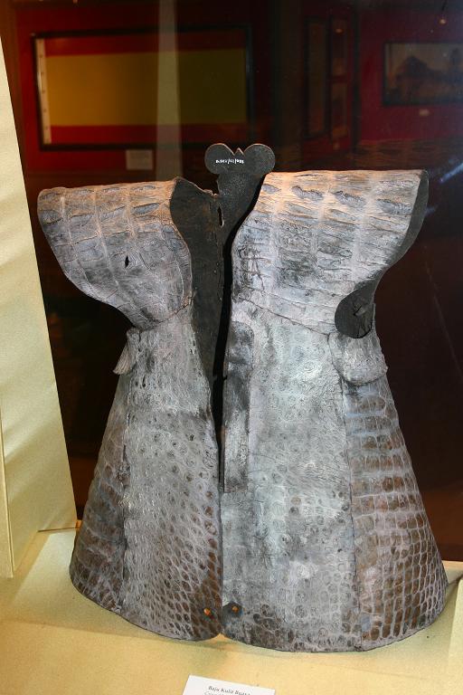 Heres some armour used by Malays. The first is made of tin and the second made of crocodile skin.