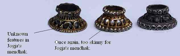 Yes, Mas Ganja. All the mendhak's pictures on your latest post are Jogjas, IMHO. The one with gems is kendhit. It use filigree in spite of ordinary meniran/beads. Just a variation, I think. Kendhit means belt, belted with gems, in this case, and the one with metal ball called mendhak lugas. Lugas simply means 'plain'. The kendhit is not necessarily better than lugas. With a good balance and execution, the lugas frequently beat the ordinary kendhit, in term of beauty, not money, of course