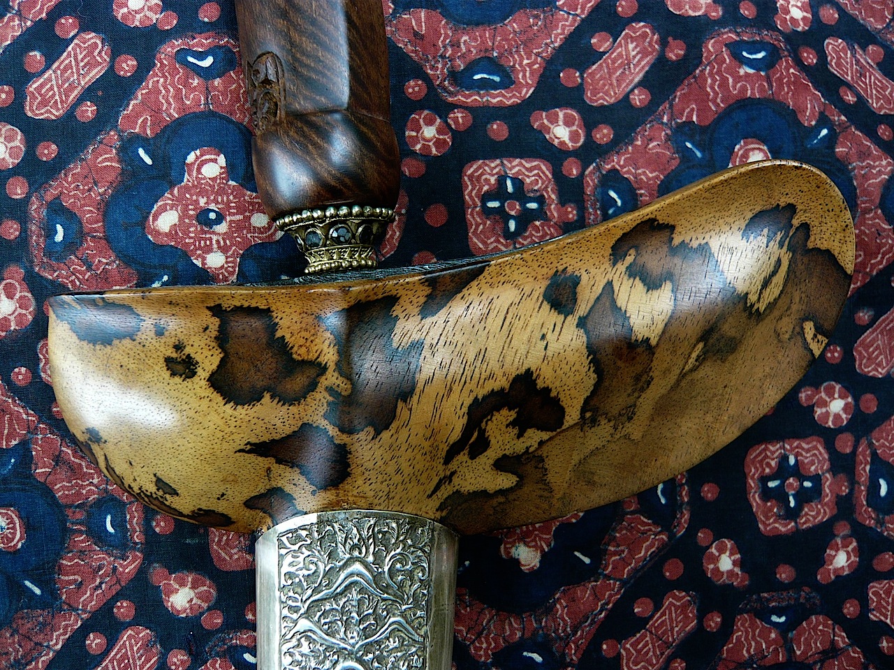 Most of the fungi that produce spalting patterns are wood rotters, and unless the wood in the keris and sheath have been treated to kill the fungus, they will keep rotting away, albeit slowly in most cases. I'm not an expert on treating wood rot, but please be aware of the possibility, and check to see if the pattern changes over time. If it does, you may want to have it treated at some point.